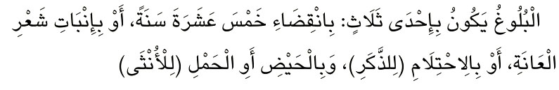 Baligh dapat terjadi dengan tiga hal: genap berusia lima belas tahun, tumbuhnya rambut pada kemaluan, atau mengalami mimpi basah bagi laki-laki; sedangkan bagi perempuan, tanda baligh juga bisa dengan haid atau hamil.